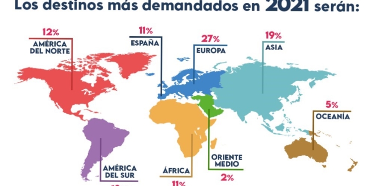 Respecto a los posibles lugares de destino que podrían elegir los viajeros, estos se decantan principalmente por el destino nacional. Un 40% prefiere quedarse cerca de casa y elige España. Un 37% opta por destino de larga distancia, mientras que un 23% prefiere conocer Europa. Sin embargo, para el 2021, la situación cambia. Las tres primeras zonas que encabezan la lista son Europa, Asia y América del Sur. Así, un 27% se inclinará por territorio europeo, un 19% prefiere Asia y el 13% se queda con América del Sur. América del Norte y España ocupan cuarto y quinto puesto respectivamente.