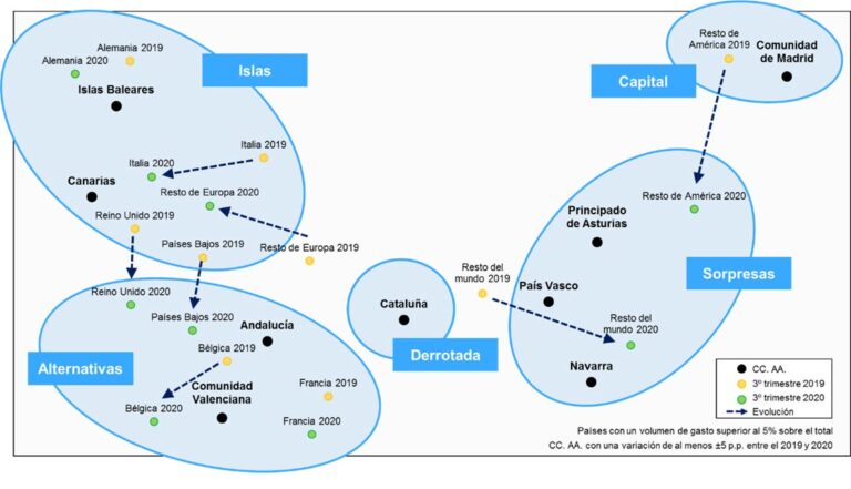 Las limitaciones de movimiento que ha sufrido el Turismo ha provocado que los turistas extranjeros hayan modificado los destinos a los que viajar durante estos meses. Según el Barómetro Turístico de Braintrust, los franceses y alemanes son los turistas que menos han variado las zonas de España donde suelen pasar sus vacaciones, al igual que los alemanes, que se han mantenido fieles a Baleares (un 51% las eligieron) y Canarias (21%). Asimismo, el 54% de los italianos también optaron por las islas (37% a Baleares y 17% a Canarias), un 9% más que en 2019. Por su parte, los turistas de origen francés junto con los belgas, mantienen la prioridad por Andalucía y la Comunidad Valenciana. Durante este verano se han unido a ellos los ingleses y holandeses.