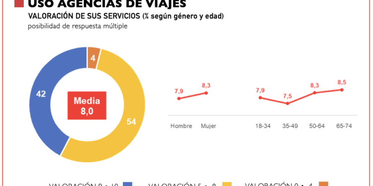 Cuatro de cada 10 viajeros que ha realizado una reserva en una agencia de viajes en los últimos meses otorga una valoración muy alta (9 ó 10) a la satisfacción con el servicio recibido (42%).