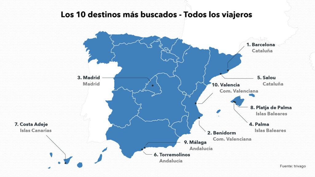 Ingleses, alemanes, italianos, franceses e irlandeses son las principales nacionalidades que buscan España para este verano. Barcelona se mantiene como su destino favorito, seguido por Benidorm y Madrid, a estos les siguen destinos de playa como Palma, Salou, Torremolinos y Costa Adeje.