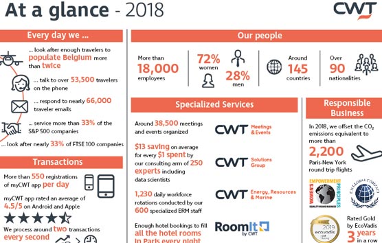 CWT ha señalado que, en su «objetivo de ser la plataforma líder mundial de gestión de viajes de empresa y en línea con nuestra estrategia CWT 3.0, nuestro enfoque sigue centrado en la experiencia del cliente, en las oportunidades de crecimiento, en la ejecución centralizada y en una buena cultura de empresa. Nuestros resultados de 2018 demuestran con claridad el impacto de nuestros logros en estas áreas».