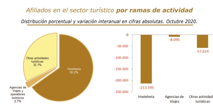 Como era de esperar, este nuevo descenso se debe principalmente a la grave situación que atraviesa la hostelería, cuya actividad de ha visto paralizada de nuevo por los cierres impuestos por algunas Comunidades ante los repuntes de casos de Covid-19. Solo este subsector ha sufrido la pérdida de 213.195 afiliados, es decir, el 76% de la caída total. El resto de actividades turísticas han disminuido en 57.624 afiliados, siendo las agencias de viajes las menos afectadas durante este mes, con una disminución de 8.095 trabajadores.