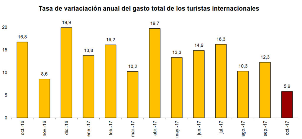 Aunque crece con menor intensidad que en meses anteriores, el gasto efectuado por los turistas internacionales en Cataluña vuelve a mostrar una evolución favorable en octubre. Mientras que la inestabilidad política vivida tras el referéndum sí impacta de manera significativa en las entradas, con un retroceso interanual del 4,7% en octubre, el desembolso registra un incremento del 4,9% en el mismo mes, ascendiendo a 1.525 millones de euros. El gasto en toda España se sitúa en 7.763 millones de euros, un 5,9% más que hace un año.