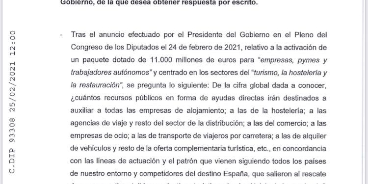 Por ello, ante esta incertidumbre, según ha podido saber NEXOTUR, el diputado por Alicante ha presentado una pregunta al Gobierno, con el fin de conocer cual es el fin de esta plan y como está organizado y planteado. «De la cifra global dada a conocer, ¿cuantos recursos públicos en forma de ayudas directas irán destinados a auxiliar a todas las empresas de alojamiento; a las de hostelería; a las agencias de viajes y resto del sector de la distribución; a las del comercio; a las empresas de ocio; a las de transporte de viajeros por carretera; a las de alquiler de vehículos y resto de la oferta complementaria turística, etc., en concordancia con las líneas de actuación y el patrón que vienen siguiendo todos los países de nuestro entorno y competidores del destino España?».