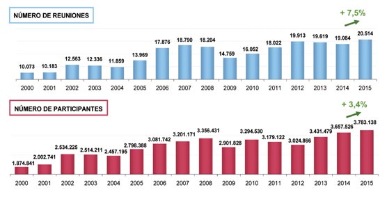 En cuanto a las sedes de celebración, los palacios de congresos se han convertido en 2015 en la principal sede (32%), por encima de los hoteles (26,9%). Les siguen las universidades (15,3%) y los auditorios (7,3%). La duración media de las reuniones ha sido de 2,05 días, reduciéndose en 0,42 días respecto a 2014. Las reuniones mayoritarias (51,4%) han sido de hasta dos días.