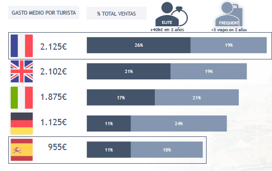 El informe anual de Global Blue incorpora por primera vez la distribución de turistas de largo radio por países según su gasto y frecuencia de viaje, distinguiendo entre turistas de élite (más de 40.000 euros gastados en los dos últimos años), frecuentes (tres viajes en dos años) y poco frecuentes (menos de un viaje al año). Llama la atención que sólo el 11% de los ingresos por compras de extracomunitarios que registra España proceden del primer perfil, lo que le sitúa a la cola en su captación. Los porcentajes distan de los alcanzados por las grandes potencias, como el 26% de Francia, el 21% de Reino Unido y el 17% de Italia.