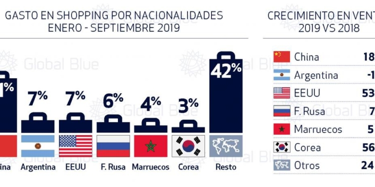 China se mantiene en lo más alto de la tabla con una cuota del 31%. Además, protagoniza un incremento del 18%. Por detrás figuran Argentina y Estados Unidos, con un 7% del total de las ventas cada uno. Son la segunda y tercera nacionalidad que más gasta en compras en España, si bien su presupuesto evoluciona de manera desigual por el comportamiento de su divisa. La devaluación del peso argentino influye en que el gasto en shopping de los primeros caiga un 1% en los nueve primeros meses del año. Por el contrario, la fortaleza del dólar frente al euro motiva que los norteamericanos aumenten en un 53% su gasto en compras.