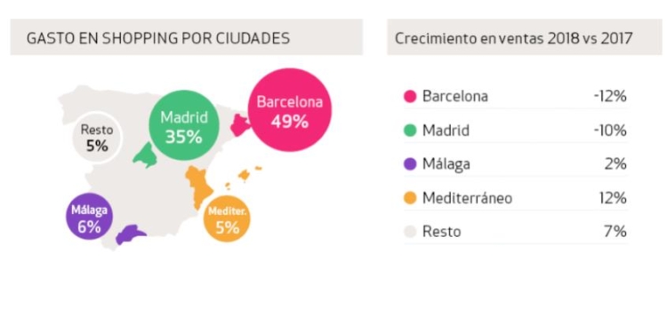 Teniendo en cuenta que el Turismo de compras es un Turismo de ciudades y no de países, las cifras evidencian que esta imagen poco atractiva de España en el exterior afecta a sus dos principales destinos de shopping. Barcelona, que concentra el 49% del gasto, ha sufrido una reducción de ingresos del 12%. Madrid, por su parte, registra una caída del 10%, acaparando el 35% del total. En cambio, la zona del Mediterráneo (Comunidad Valenciana y Baleares) y Málaga muestran avances del 12% y del 2%, respectivamente.