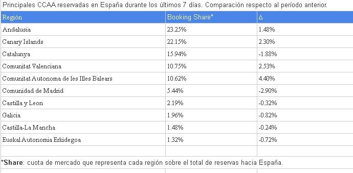 Por otra parte, pese a que no es la Comunidad que más crece en este nuevo periodo, el informe sitúa a Andalucía como la que sigue disponiendo de la mayor cuota de mercado (23,2%) de todo el país, aumentando solo un 1,4% respecto a la semana anterior. Su inmediato perseguidor es Canarias, con el 22,1% del total y manteniéndose estable durante este periodo. Después, ambas con porcentajes también superiores al 10% se encuentran la Cataluña, Comunidad Valenciana y Baleares (15,9%, 10,7% y, 10,6% respectivamente).