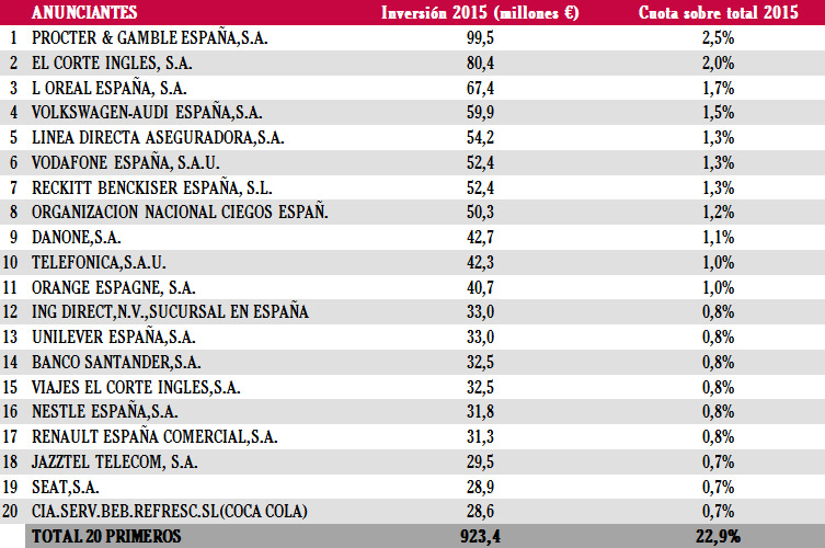 Viajes El Corte Inglés se encuentra en décimo quinto lugar de la tabla, cinco puestos por debajo de la posición que ocupaba en 2013, cuando su inversión ascendió a 39,5 millones de euros. La primera posición es para Procter & Gamble España (99,5 millones), seguida de El Corte Inglés (80,4 millones) y Loreal España (67,4 millones).