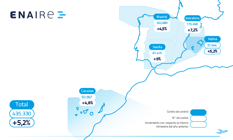 En este arranque de año se han incrementado los vuelos en todos los centros de control de Enaire. Destacan los crecimientos de Sevilla (+9% y 91.475 vuelos), Barcelona (+7,2% y 175.458), Palma (+5,2% y 37.644), Canarias (+4,8% y 92.987) y Madrid (+4,5% y 262.880).