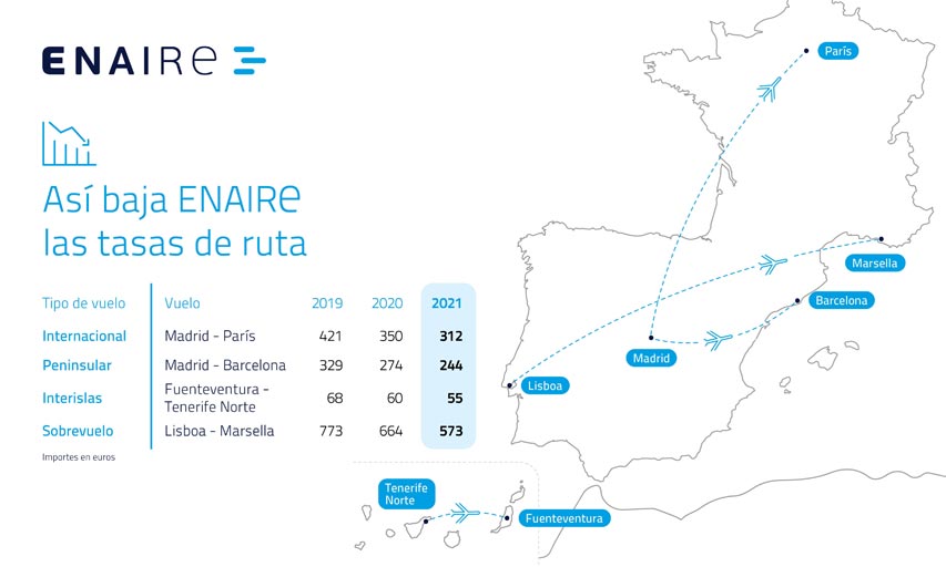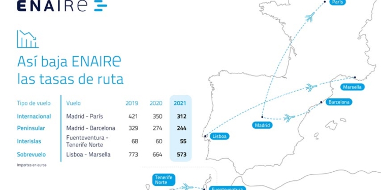 Estas reducciones van a suponer una caída notable en el precio a pagar por las compañías aéreas. Por ejemplo, desde Enaire estiman que un vuelo internacional desde Madrid hacia París de una aeronave B763 con 185 toneladas y 357 kilómetros de recorrido pasaría de pagar 350 euros en 2020 a 312 euros en 2021. Igualmente, el pago de un vuelo peninsular desde Madrid al Aeropuerto Josep Tarradellas Barcelona-El Prat de una aeronave A320 de 73 toneladas y 443 kilómetros caería de 274 euros a 244. Finalmente, un viaje interislas desde Fuerteventura a Tenerife Norte de un avión AT76 de 23 toneladas pasaría de pagar 60 euros a 55 euros.