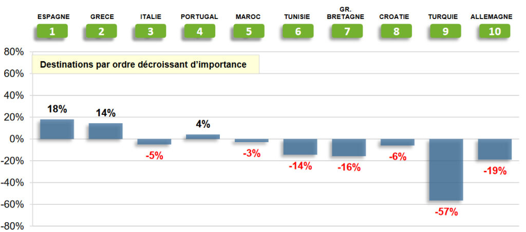 España esquiva la caída experimentada por el mercado emisor francés. Según los últimos datos dados a conocer por la Asociación Francesa de Agencias de Viajes (SNAV), el volumen de reservas efectuadas durante julio para viajar a destinos españoles experimenta un fuerte aumento interanual del 18%.