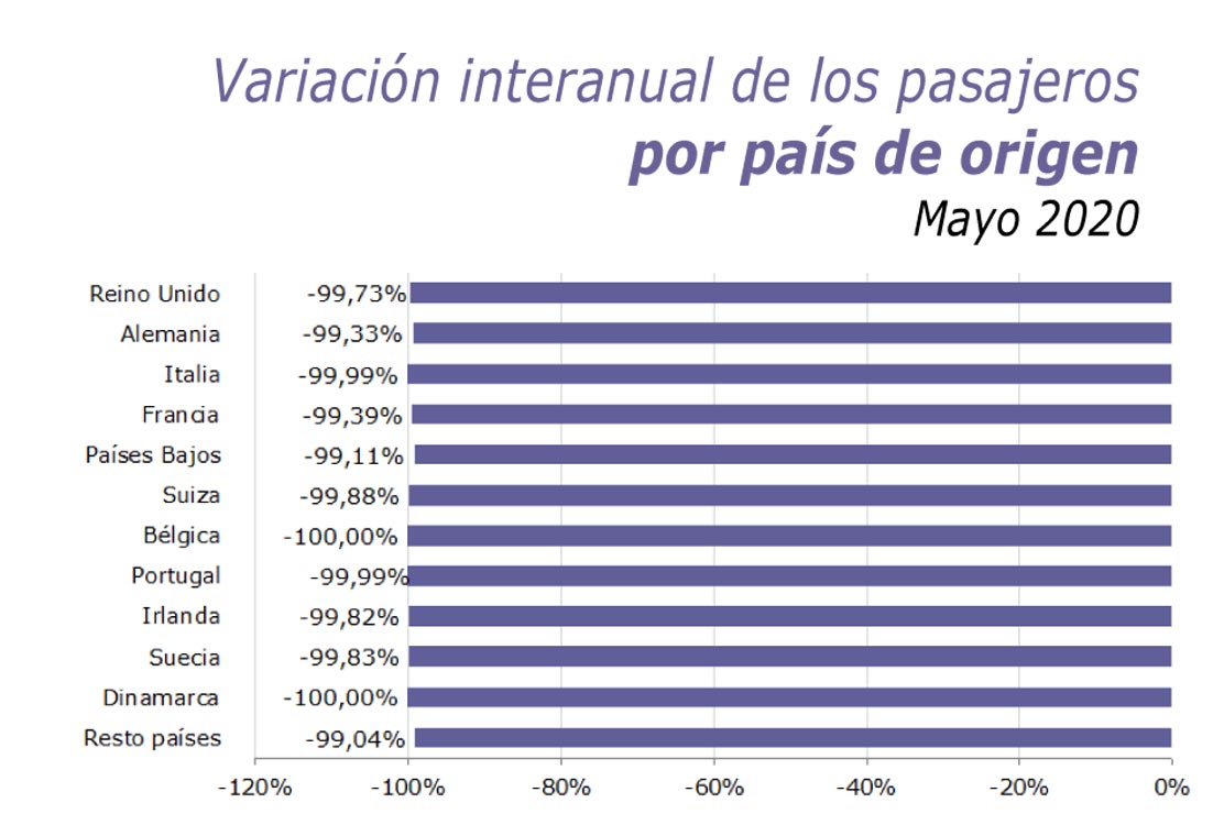 Mayo es uno de los meses más afectados debido a la vigencia de las restricciones en numerosos países, registrando solo 43.694 pasajeros procedentes de aeropuertos internacionales, un 99,5% menos que en el mismo mes del 2019. El 9,8% de estos eligieron una compañía aérea de bajo coste para desplazarse, experimentando un descenso del 99,9%, mientras que los pasajeros que viajaron en compañías tradicionales, el 90,2% restante, decrecieron un 98,9%.