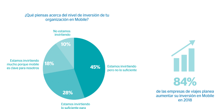 Según el informe, un 84% de las empresas de viajes planea aumentar el presupuesto destinado al mobile en el presente ejercicio. Respecto al nivel de inversión actual, llama la atención que un 45% reconoce no estar invirtiendo lo suficiente y un 10% no destina nada a esta partida. Por el contrario, un 28% afirma invertir lo suficiente para igualarse con la competencia y el 18% restante tiene un presupuesto muy elevado.