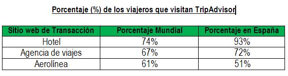 Según el estudio de comScore, TripAvisor ha sido el portal web y la aplicación más visitados por los consumidores. Por detrás de este, se encuentran Booking, Trivago, Hotels.com y Expedia. Según los datos obtenidos, el 73% de las primeras búsquedas en todo el mundo no mencionan un destino o marca concretos, en el caso de España asciende hasta el 78%.