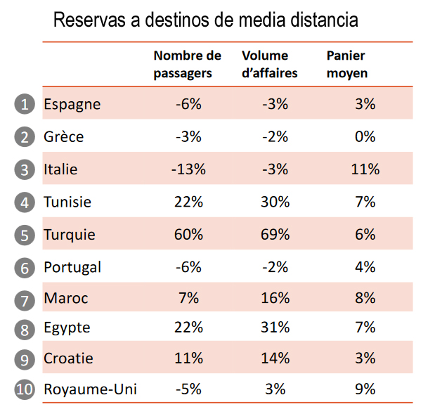 Todo lo contrario sucede con los destinos que en los últimos años se vieron severamente afectados por la inestabilidad política y social. Túnez, en cuarta posición del ranking, protagoniza un crecimiento interanual del 22% en el emisor francés. Mayor aún es el avance de Turquía, con un incremento de las reservas del 60% en comparación con el verano de 2018. Egipto, por su parte, logra un aumento del 22%, mientras que en el caso de Marruecos la tasa es del 7%.