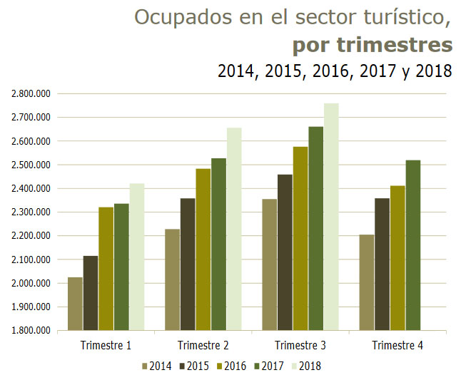 En este trimestre, la economía española ha creado en torno a 478.000 puestos de trabajo, de los cuales el 20,6% corresponden al Turismo. Los ocupados en Turismo representan el 14,1% del empleo nacional. Aumentan tanto los asalariados (+3,8%), como los autónomos (+3,5%) del Sector turístico.