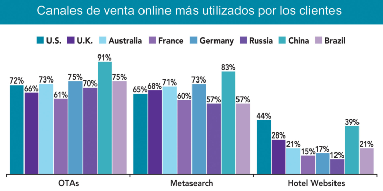 Las diferencias entre unos y otros canales de distribución se acortan en los que, a día de hoy, son los dos grandes mercados emisores del planeta: Estados Unidos y China. En el caso concreto del primero, un 72% y un 65% de los encuestados afirman utilizar agencias online y metabuscadores, respectivamente, mientras que un 44% también acude a las páginas web de los hoteles. En China, los sites de los hoteles son usados por un 39% de los clientes, mientras que el porcentaje se dispara hasta el 91% en el caso de las agencias online y hasta el 83% en el de los metabuscadores.
