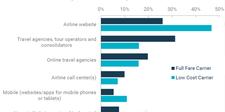 Según se desprende de un informe de Phocuswright, en el caso concreto de las aerolíneas convencionales, entre agencias de viajes físicas y online generan aproximadamente el 50% de los ingresos a nivel mundial, correspondiendo a las primeras un 31% y a las segundas el 19% restante.