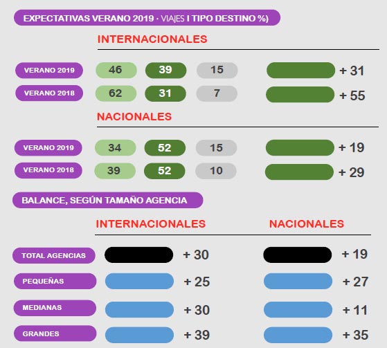 En el caso de los destinos nacionales, un 34% de las agencias prevén mejorar los resultados de hace un año y un 52%, igualarlos. Las expectativas más positivas corresponden a los destinos de playa. No obstante, éstas disminuyen si se comparan con 2018, tanto las que se refieren a destinos peninsulares como a islas. Los espacios naturales y los destinos rurales continúan con balances levemente negativos. Se mantiene el ligero optimismo del verano pasado en relación a parques temáticos y circuitos nacionales.