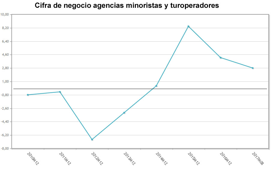 La producción de las agencias de viajes sigue creciendo, si bien lo hace cada vez con menos intensidad. Según estimaciones del Instituto Nacional de Estadística (INE), el volumen de negocio de minoristas y turoperadores experimenta en los ocho primeros meses del año un repunte interanual del 2,8%.