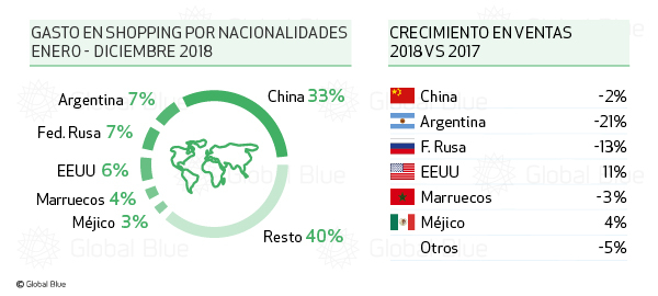 De las principales potencias emisoras, tan solo Estados Unidos y México muestran en 2018 un comportamiento favorable, con tasas respectivas del 11% y del 4%. Las mayores caídas corresponden a Argentina y Rusia, con un -21% y un -13%. China, mercado líder con el 33% de los ingresos tax free, concluye el ejercicio con un retroceso del 2%. La coyuntura económica y la devaluación de las monedas de los países de origen son las principales causas que se esconden detrás del mal comportamiento observado en 2018.