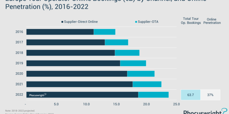 Debido al costo relativamente alto y a la relativa complejidad de los ‘paquetes’ turísticos, los turoperadores europeos tienen mayor presencia en el canal tradicional de ventas, siendo el segmento con la menor penetración online. Sin embargo, cada vez invierten más en mejorar y promover sus plataformas digitales. Phocuswright estima que su penetración en el negocio online se incrementará hasta el 37% en el año 2022.
