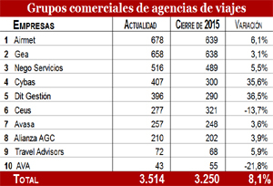 Cybas figura en cuarta posición con 407 puntos de venta. El Grupo comercial que dirige Vicente García se ha visto reforzado en los últimos meses con la incorporación de las aproximadamente 120 agencias de Click Viaja. Este acuerdo les permite crecer un 35,6% en relación a la conclusión de 2015, cuando rondaba los 300 asociados. También protagoniza un espectacular incremento del 36,5% Dit Gestión, que pasa de 290 a 396 oficinas, situándose en quinto lugar.