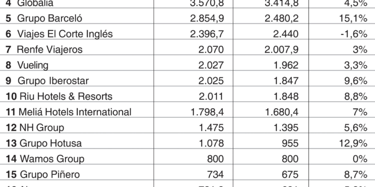 Según se desprende de los resultados de 2016 de National Express, grupo británico del que Alsa forma parte, el volumen de negocio de la compañía de transporte de viajeros por carretera sube un 5,8%, hasta los 731,2 millones. Logitravel, que además de su agencia online dispone de Traveltool —su potente Business to Business (B2B)—, vuelve a experimentar un aumento de doble dígito (+12,4%), alcanzando los 533 millones de euros. Una posición más abajo está Carlson Wagonlit Travel (CWT) España con 480 millones, cifra idéntica a la que obtuvo en 2015, mientras que Trasmediterranea figura en décimo noveno lugar con un volumen de 321 millones, un 1,6% más. Cierra la tabla Jumbotours con 352 millones (+7,3%).