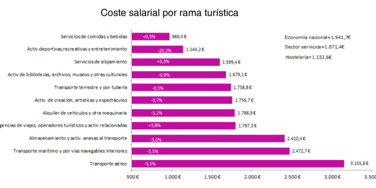 Entre las diferentes ramas turísticas, el transporte aéreo es, con amplia distancia, el que registra los mayores niveles de ingresos entre sus trabajadores. El coste salarial es de 3.155,8 euros, lo que supone un 5,5% más que en el segundo trimestre de 2014. El salario medio en este subsector turístico es un 75% superior al de los agentes de viajes.