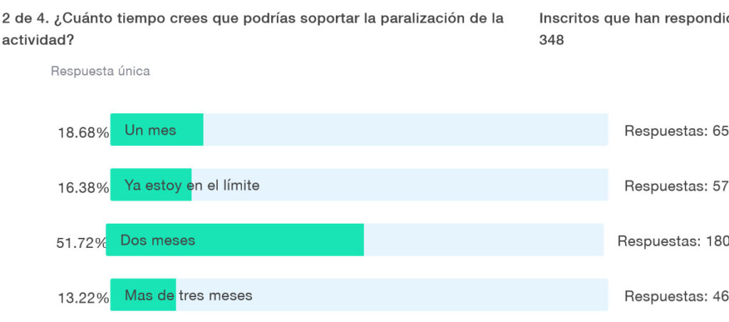 Muchas empresas, especialmente las pymes, están viviendo unas circunstancias dramáticas debido a las cancelaciones provocadas por la crisis del coronavirus. La incertidumbre y la falta de liquidez están golpeando duramente a la industria. Según la encuesta llevada a cabo por Bookingfax, al menos 16,38% de las agencias se encuentran en una situación límite. Un 18,68% piensa que podrá aguantar el tirón durante un mes, frente a un 51,72% que valoran que podrán hacerlo durante dos. Tan solo, un 13, 22% creen posible sostener esta coyuntura durante más de tres meses.