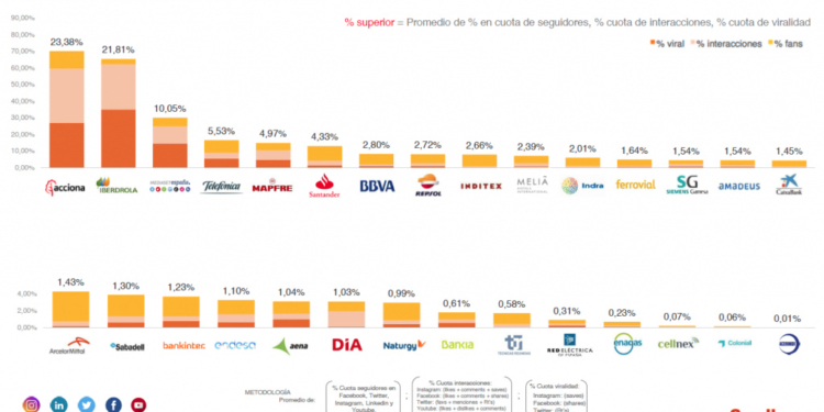 Según el informe, las compañías del Ibex 35 generan una actividad muy elevada en redes sociales, similar a la de otros sectores de mucha actividad como el retail, el gran consumo o la automoción. En total, las 30 empresas con presencia en redes sociales han generado algo más de seis millones de interacciones en ocho meses, lo que confirma la apuesta de las grandes empresas españolas por abrir su política de comunicación a estos canales.