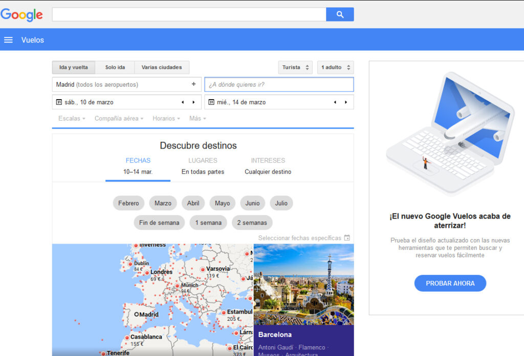 Con el objetivo de mejorar en esta cuestión, Google ha cambiado recientemente el diseño de Google Flights, dejando de lado su imagen de inspirador para intentar que los clientes perciban esta web como una herramienta eficaz para adquirir el billete. Para conseguirlo, en el nuevo site se da una mayor visibilidad a la barra de búsqueda de vuelo, mientras que la opción de ‘descubrir destinos’ pasa a una posición secundaria y, además, reduce las recomendaciones para mostrarlas de una forma más clara y ordenada.