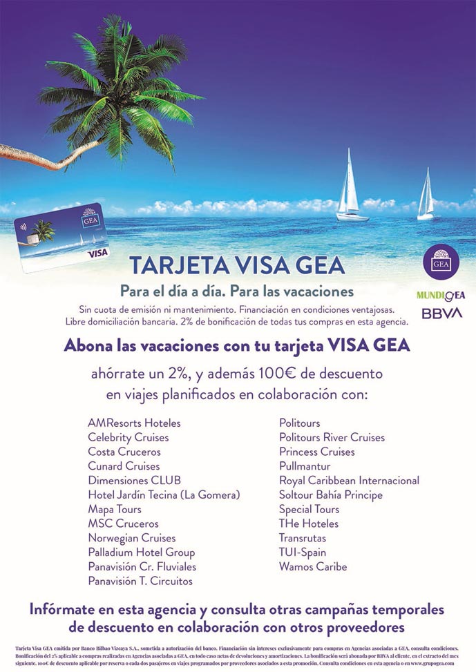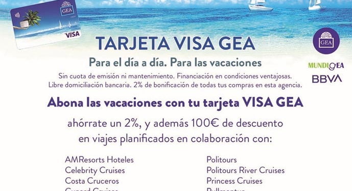 Otro punto interesante de cara a la fidelización es el descuento de 100 adicional al que pueden acceder los clientes por pagar con la Visa GEA, con una gran selección de proveedores, dice Cáceres. Además del acuerdo de la visa GEA, el grupo ofrece la opción de BBVA Finance, una alternativa de financiación para los clientes sin necesidad de tener la visa, añade el director comercial, por lo que las agencias GEA pueden ofrecer una comodidad más de pago al cliente.