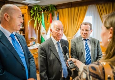 El alcalde de Roquetas de Mar (Almería), Gabriel Amat, y el concejal de Gestión Tributaria, Antonio López, han recibido la visita del presidente de la Cámara de Comercio de Almería, Jerónimo Parra, que ha estado acompañado del director general de la entidad, Víctor Cruz; una reunión en la que han señalado el compromiso de ambas entidades por potenciar el Palacio de Congresos y Exposiciones ubicado en la localidad.
