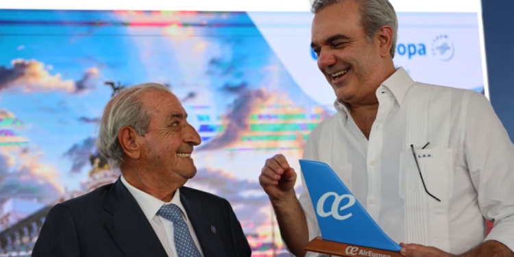 Air Europa inició el pasado jueves 27 su nueva ruta a la ciudad de Santiago de los Caballeros, con la que amplía a tres los destinos con los que conecta Madrid con República Dominicana. El primer vuelo, inaugurado por el presidente de Globalia, Juan José Hidalgo, fue recibido en el Aeropuerto Internacional del Cibao por una delegación encabezada por el presidente del país, Luis Abinader, y diferentes autoridades regionales y locales.