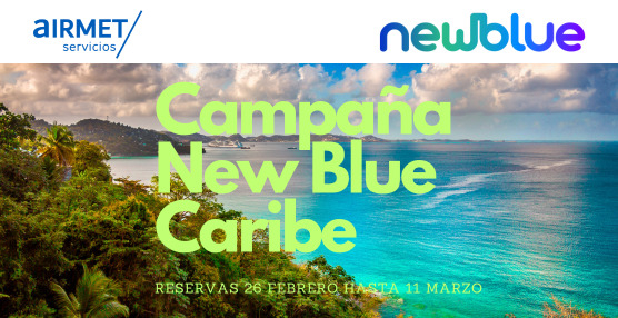 Airmet cierra una nueva acción comercial con New blue, en esta ocasión ‘Campaña Newblue Caribe’, mediante la cual las agencias Airmet se beneficiarán de excelentes comisiones.