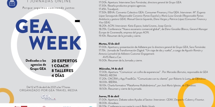 Serán cuatro días intensos. Todo el equipo humano de Grupo GEA se ha involucrado de lleno en el desarrollo de estas primeras jornadas online. Han sido muchas horas de trabajo y de entusiasmo, de trabajo en equipo pensando en cómo satisfacer las necesidades de nuestras agencias. Y, por fin, son una realidad, finaliza la directora general de Grupo GEA.