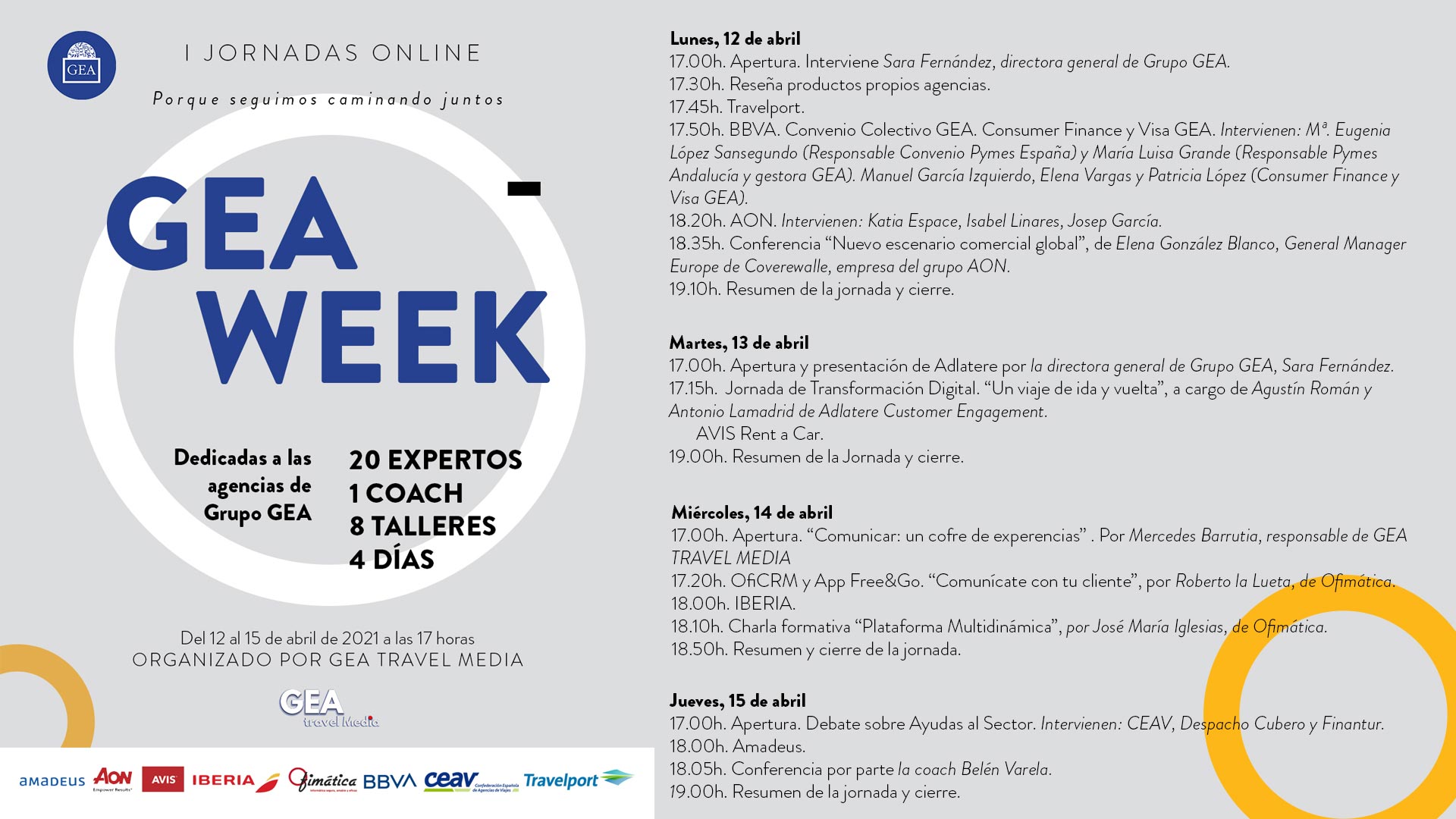 El pistoletazo de salida ya ha sonado. La productora audiovisual de Grupo GEA, GEA TRAVEL MEDIA, organizadora de la GEA WEEK, tiene todo previsto para que las jornadas arranquen puntualmente. El principal protagonista de hoy es BBVA y AON, que nos hablarán de los acuerdos relacionados con la financiación que la entidad bancaria tiene con el Grupo y, por otra parte, de solvencia y seguridad. El martes presentaremos a una nueva asesoría de Grupo GEA. El miércoles está dedicado a la comunicación y a la digitalización, contaremos con la participación de Ofimática. El jueves tendremos un debate de actualidad a cargo de nuestros asesores fiscal y jurídico y el presidente de CEAV. Y terminaremos con el ánimo bien alto gracias a nuestra coach, Belén Varela, quien impartirá una charla motivacional sobre liderazgo de resistencia, explica la responsable de GEA TRAVEL MEDIA, Mercedes Barrutia.