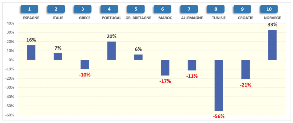 Al igual que España, las reservas efectuadas para visitar Portugal y Noruega experimentan aumentos de dos dígitos, del 20% y del 33%, respectivamente. En el lado opuesto aparecen Túnez, Croacia y Marruecos, que sufren desplomes del 56%, 21% y 17%, respectivamente.