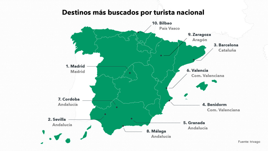 Además de los destinos mencionados, los turistas españoles también consideran Benidorm, Granada, Valencia, Córdoba, Málaga, Zaragoza y Bilbao entre sus 10 alternativas favoritas para pasar esta época del año. En referencia al precio medio por noche, el destino más caro por noche de hotel es Sevilla, donde se sitúa en 130 euros. Le siguen los destinos de Bilbao, con 219 euros; Valencia y Málaga, con 217 euros. De estos destinos populares, son Zaragoza y Benidorm los que ofrecen una tarifa media menor con 81 y 99 euros respectivamente.