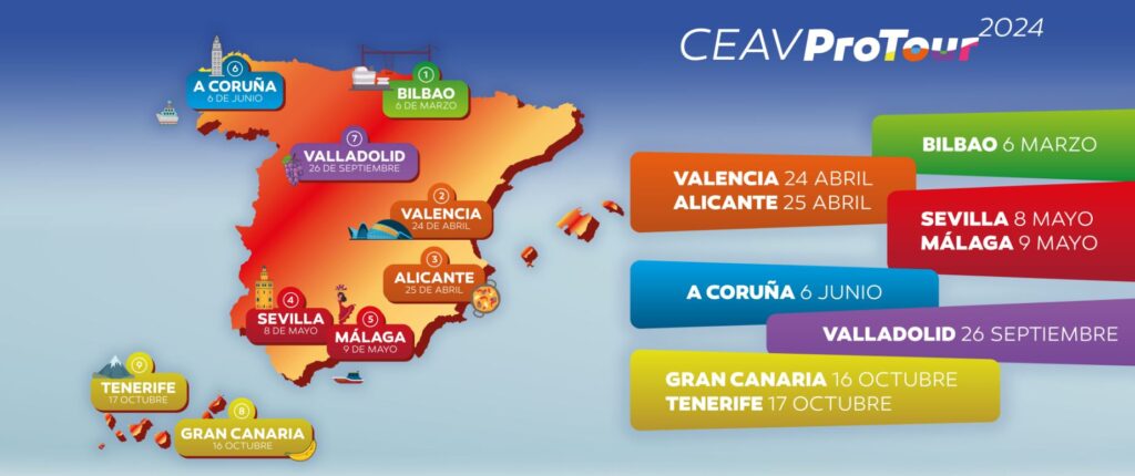 El CEAV ProTour 2024 comenzará el 6 de marzo en Bilbao, para continuar después el 24 de abril en Valencia y el 25 de ese mismo mes en Alicante. Más tarde, llegará a Sevilla el 8 de mayo y Málaga el 9. Ya en junio, las jornadas profesionales se realizarán en A Coruña el 6 de junio. Valladolid será la última ciudad de la península que acogerá este tour, con fecha de 26 de septiembre. Por último, el 16 de octubre llegará a Gran Canaria y, para finalizar, Tenerife acogerá el evento de clausura el 17 de ese mismo mes.
