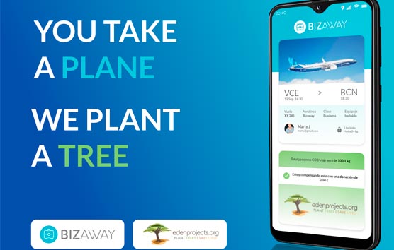 De esta manera, BizAway se ha convertido en la primera plataforma que ha automatizado la compensación directa de las emisiones de dióxido de carbono que resultan de la plantación de árboles. En base a la calculadora de emisiones de carbono de la OACI (Organización de la Aviación Civil Internacional), un vuelo de ida Venecia – Barcelona de un pasajero emite 100,1 kg de CO2, que puede ser compensado con una donación de 0,04 euros. BizAway ha adaptado su plataforma para que se pueda plantar un manglar por cada 0,10 euros donados a Eden Reforestation Projects por los clientes. Para hacerlo más efectivo, el mecanismo de compensación se aplica no sólo a los vuelos, sino también a otros verticales que pueden gestionarse a través de BizAway e incluyen las estancias en hoteles, alquiler de coches y las estancias en hoteles, según algoritmos de cálculo de emisiones dedicados.