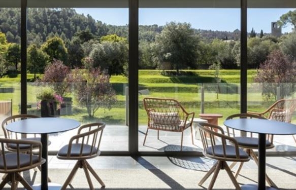 El nuevo deiseño del hall del Hotel Món, ha estado a cargo del estudio Borrós Interiorisme, se abre a la naturaleza que lo rodea, el complejo cultural, turístico y de ocio Món Sant Benet.