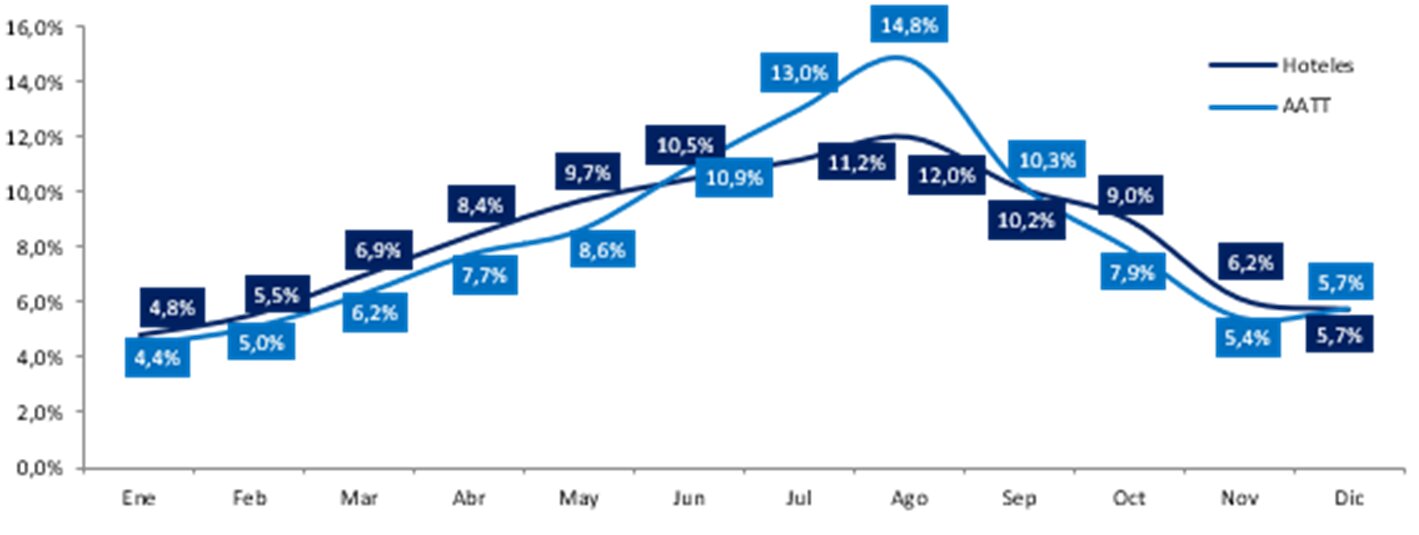 La consultora remarca que la nueva reforma laboral no tendrá efecto en la industria turística, hasta que la desestacionalización sea una realidad en nuestro país, dados los picos que la actividad sufre ante la falta de estrategias de segmentación de la demanda, la escasa innovación en las propuestas de valor, y la carencia de planes estratégicos a corto, medio y largo plazo. Así, según el gráfico que dibuja Braintrust en un un año representativo como 2019, se muestra la concentración del alojamiento en los meses de mayo a septiembre, frente al bajo movimiento fuera de dicho período, lo que supone una inmensa dificultad para la sostenibilidad económica del modelo, y con ello para una empleabilidad continuada.