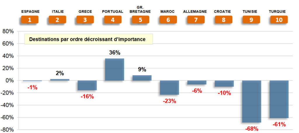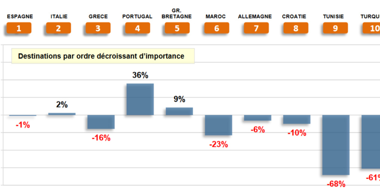Tras España, que se mantiene como la primera opción de los turistas franceses, se encuentran Italia y Grecia. Las reservas realizadas para visitar el primero aumentan un 2% en marzo, mientras que en el caso del segundo experimentan un importante descenso del 16%. Todo lo contrario ocurre con Portugal, que registra el mayor incremento del mes (+36%), mientras que Gran Bretraña, en quinto lugar, también muestra un avance del 9%.