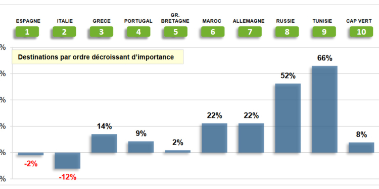 También protagonizan fuertes aumentos destinos como Grecia (+14%), Marruecos (+22%), Alemania (+22%) y Rusia (+52%). En el lado opuesto se encuentra Italia, que sufre un retroceso del 12%.
