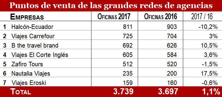 Las grandes agencias de viajes que operan en el mercado español crecen tímidamente en puntos de venta. Según los datos recabados por NEXOTUR, las siete primeras suman al cierre de 2017 3.739 oficinas, lo que supone un incremento del 1,1% en comparación con las 3.697 sucursales que disponían un año antes.