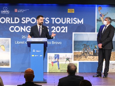 El consejero de Empresa y Trabajo de la Generalidad de Cataluña, Roger Torrent, y el secretario general de la Organización Mundial del Turismo, Zurab Pololikashvili, han presentado esta mañana el I Congreso Mundial de Turismo Deportivo y su programación en una rueda de prensa celebrada en Barcelona. El evento, que tuvo que posponerse a causa de la pandemia, tendrá lugar los próximos 25 y 26 de noviembre en el Palacio de Congresos Olympic de Lloret de Mar. Al acto también ha asistido Marta Domènech, directora general de Turismo, Ion Vilcu, director del departamento de miembros afiliados de la Organización Mundial del Turismo, Narciso Ferrer, director de la Agencia Catalana de Turismo, y Jaume Dulsat, alcalde de Lloret de Mar y vicepresidente primero del Patronato de Turismo Costa Brava Girona.